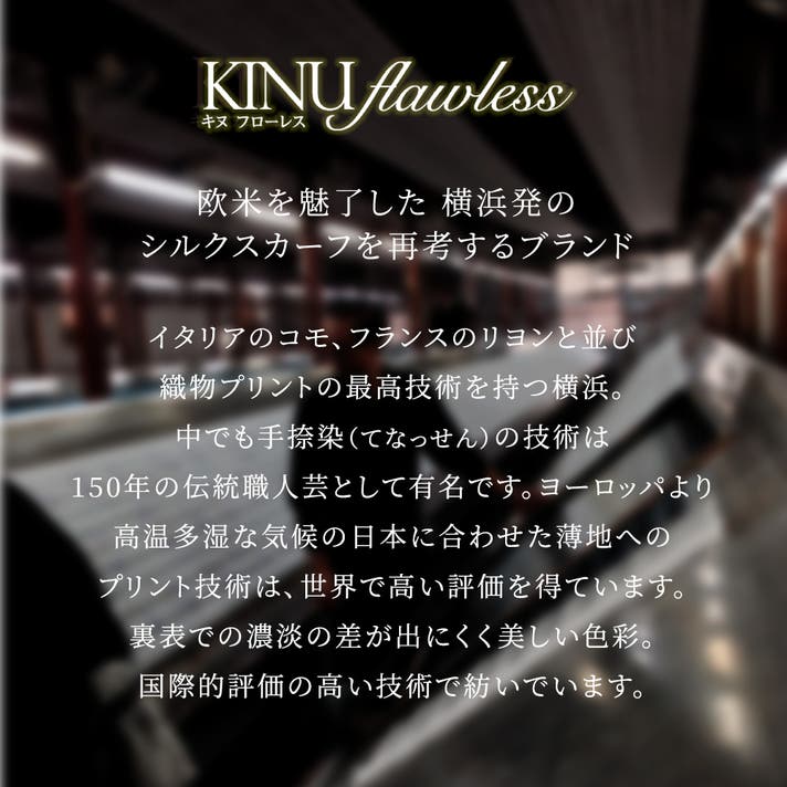 欧米を魅了した横浜発のシルクスカーフを再考するブランド。横浜は、イタリア、フランスの都市と並び、高い品質のシルクスカーフを生産しています。中でも手捺染(てなっせん)の技術は150年の伝統職人芸として有名です。 ヨーロッパと比べ温暖な気候の日本に合わせた薄地へのプリント技術は、 他のプリントよりも色彩が美しく、裏表での濃淡の差が出にくいため世界的にも評価されています。