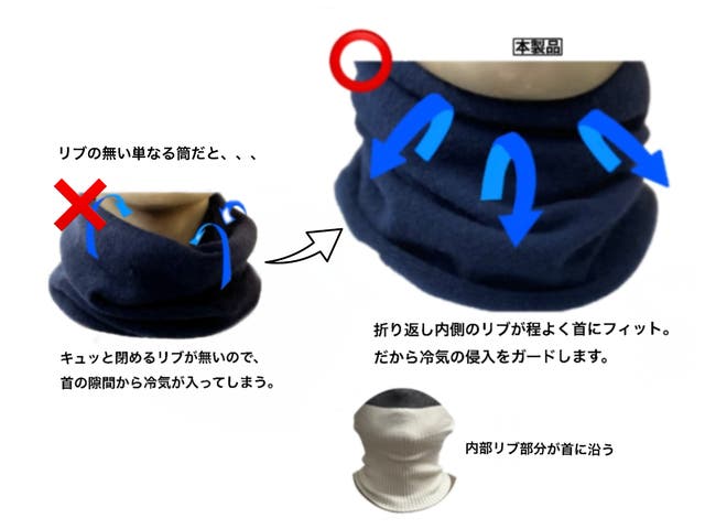 内側のリブが首回りにフィットして外気を遮断し、ふんわりクシャなのに自立する。