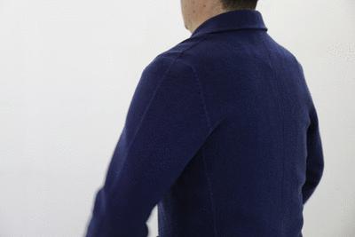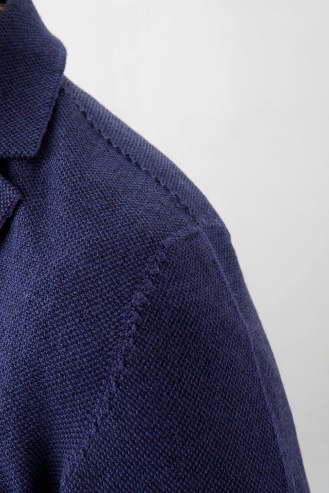 普通のジャケットは縫って仕立てられますが、このジャケットのいちばんの特徴は、ニットの「編む」ことで形を作り上げ、本来あるべきところに縫い目がないことです。