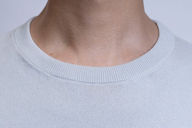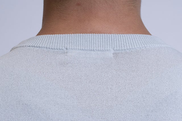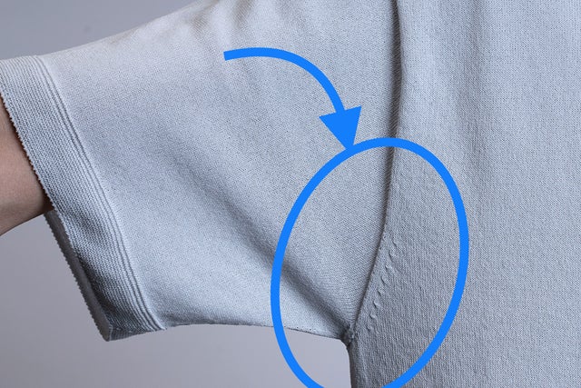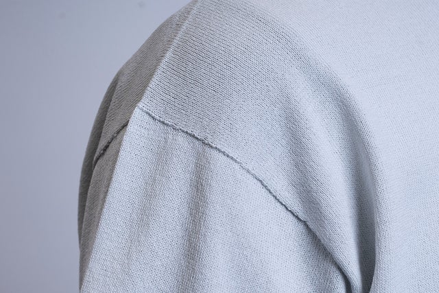 高級ニットだけに見られる、完成度に差が付く技法「ファッショニングマーク」が衿周り、袖付周りにあります。
