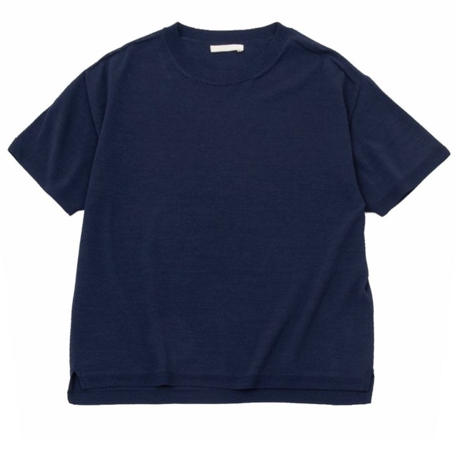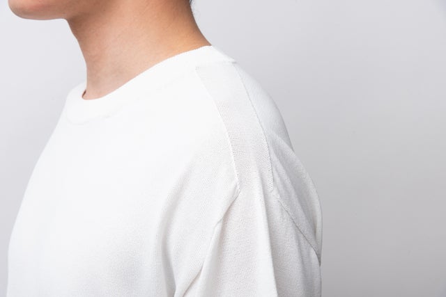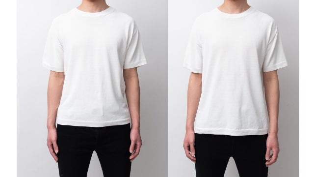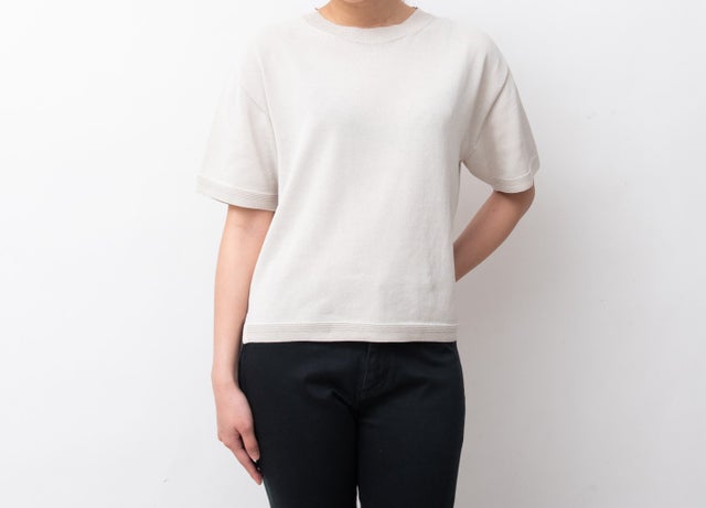 このニットTシャツは無縫製編み機により、継ぎ目のない立体成型で出来ているのも特徴です。
