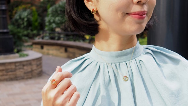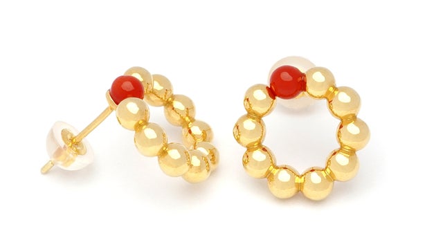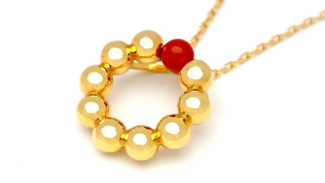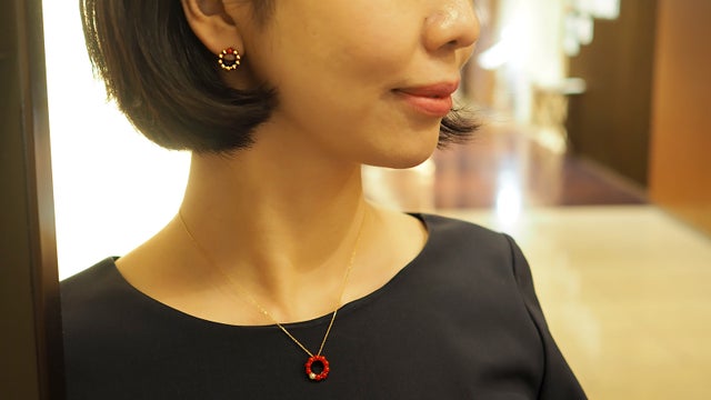 よりラグジュアリーなジュエリーをお求めの方へ、高知産赤珊瑚を贅沢に10粒使ったジュエリーを18金イエローゴールドでお作りいたしました。艶のある赤い珊瑚をつけるだけでコーディネートが上品な印象になり、艶やかな女性を演出してくれます。珊瑚は磨けば元の艶を取り戻すことができる為、一生物のジュエリーとしていつもあなたに寄り添う存在となってくれます。