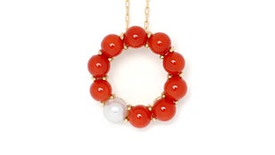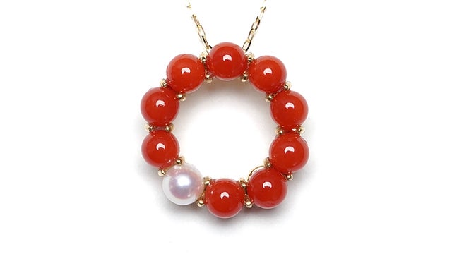 こちらも18金イエローゴールドを使ったラグジュアリーなジュエリーです。一粒だけ同じ大きさのあこや真珠をお入れいたしました。海の宝石と言われる珊瑚と真珠はとても相性が良く、お互いの輝きをより引き立ててくれる良きパートナーと言えます。赤く艶めく珊瑚の中に一粒キラリと輝く真珠。10粒のなかに込められたストーリーは身につけている人の心をワクワクさせてくれます。