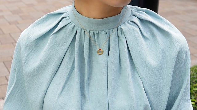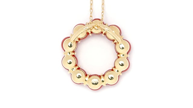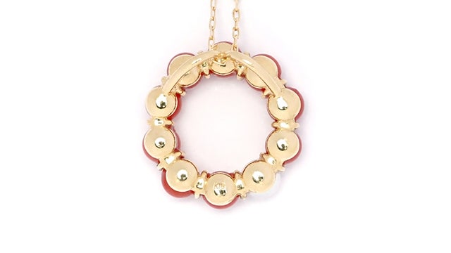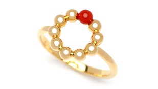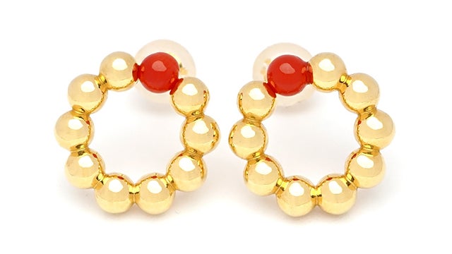 肌馴染みの良いイエローゴールドは、赤珊瑚の存在を一層引き立ててくれるお色です。遠くからでもその存在は煌びやかに輝き、華やかな印象を与えてくれます。