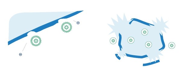 ①主成分であるポリアミノプロビルビグアナイドに特殊技術を用いてプラスの電荷率を向上することに成功。