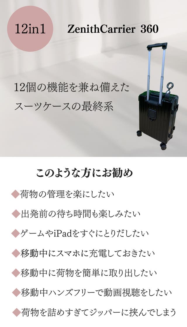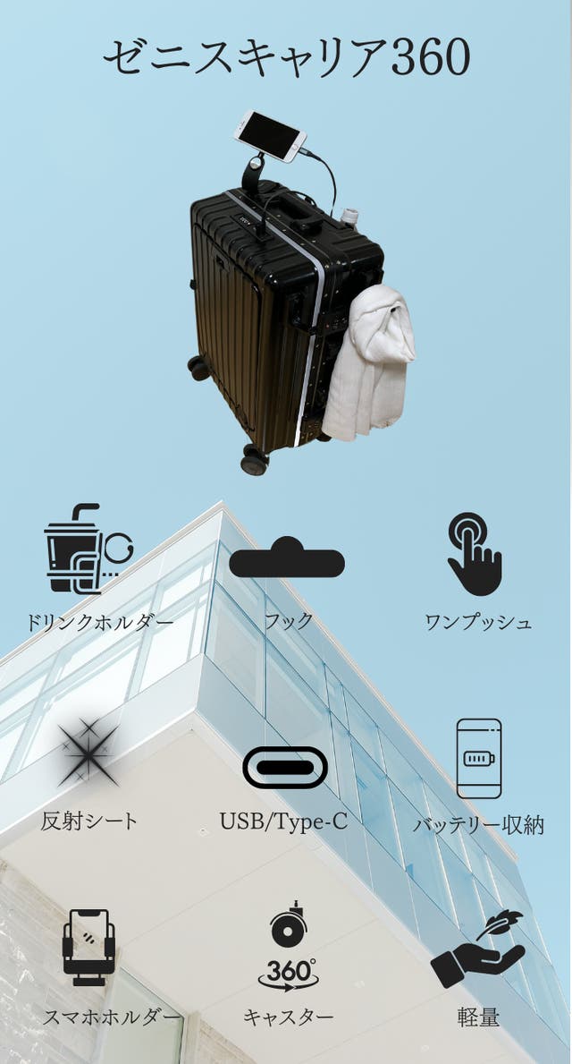 ・プロジェクトの属性 : OEM製品 ・サポート:実行者による日本語サポート ・プロジェクト実行者(国) : 日本 ・企画(国) : 日本 ・製造者(国) : 中国 ・最終製造工程 : 日本 ・ご紹介しましたゼニスキャリア360は到着した日より弊社が60日間の保証をいたしております。 問題等ございましたらMakuakeのメッセージシステムにてサポート対応いたしますのでお問い合わせ頂けますようお願いします。 ・配送について お届けには万全を期しておりますが不慮の事態等によって配送遅延等発生する可能性もございます。 遅延等発生した場合はきちんと活動報告をさせていただきますのでご安心ください。 ・メーカーでは量産体制を整えておりますが、想定を上回る応援購入を頂けた場合に、出荷時期が遅れる場合もあります。 本文中に記載させていただいたスケジュールは、あくまでプロジェクト公開時点の予定です。応援購入の性質上、配送遅延のおそれがございます。 原則として、配送遅延に伴うご購入のキャンセルはできませんが、リターン配送予定月から3ヶ月を超えた場合には、希望者に限りキャンセルにて対応させていただきます。 ・製品デザインや仕様が一部変更になる場合もあります。 ・生産効率の向上や量産体制が整い、正規販売価格が販売予定価格より下回る可能性もあります。 ・カラーなどの色合いが、デイスプレイの見え方で違って見える場合があります。 ・購入後のご購入者様都合によるキャンセルや返金は受付致しかねますので、ご承知おき下さい。 ※一部国内に類似品が出回っている可能性がございます。 弊社では他社の類似品に関してのお問い合わせには対応できませんので、ご了承ください。弊社商品のオリジナル性については、上記プロジェクトに関する情報をご覧ください。