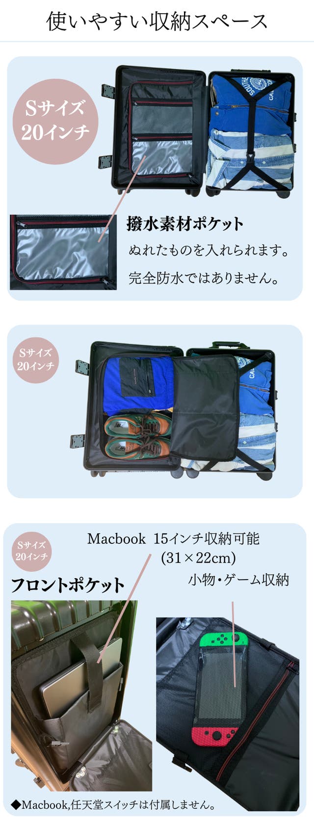 - 多機能で旅先での荷物管理が驚くほど快適に。フロント開閉で移動中の小物の出し入れも驚くほど簡単に