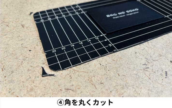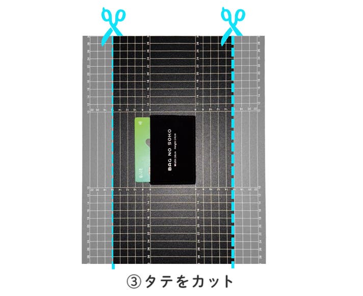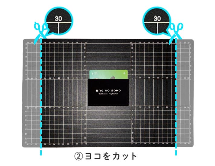 バッグの底面のヨコの長さに合わせて両サイドをカットします。もしヨコ30cmであれば、数値の30の線をカットしてください。