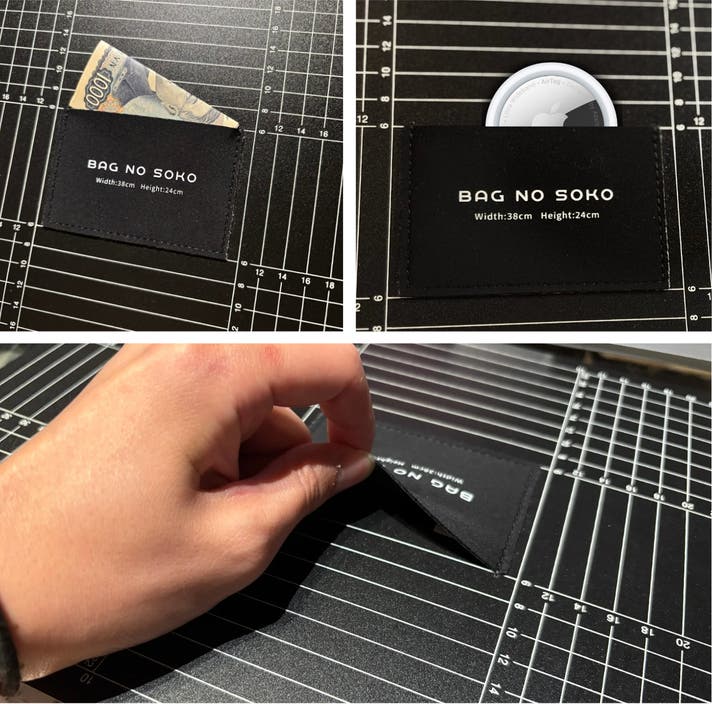 底板の中央にはいざという時に役立つ「隠しポケット」を搭載。予備のカードやお札、小銭、AirTagも収納可能。海外旅行の時に緊急用のお金を入れたり、お家の鍵やアクセサリーを入れたりなど、使い道は工夫次第で多岐に渡ります。