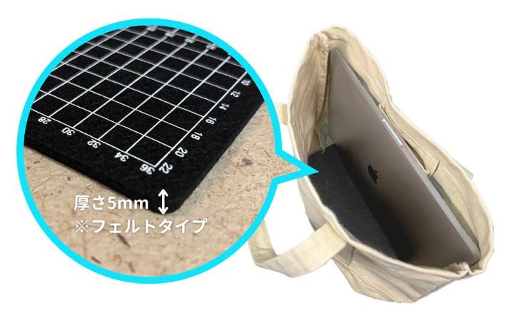 クッション性に優れた厚さ5mmのフェルト素材。薄手のトートバッグなどに設置すれば、PCなどの電子機器を入れた際に地面に置いた衝撃を和らげます。