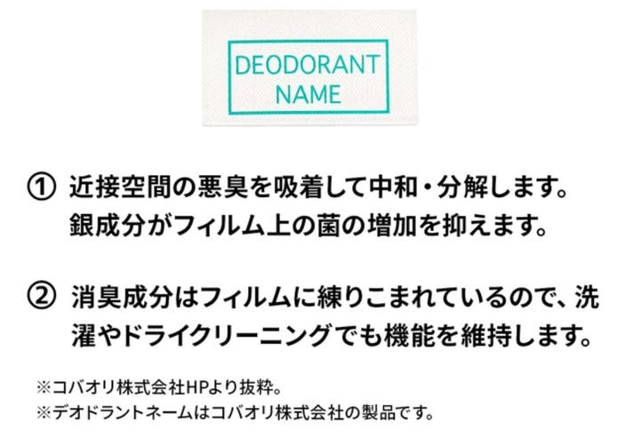 ※使用しているデオドラントタグの特徴です。本製品での消臭・抗菌性の試験は実施しておりません。
