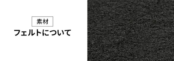 フェルトとは繊維を編んだり織ったりしないで、熱処理などで繊維を絡めあわせ固めた布の総称です。当社の工場で余った生地を活用したリユース素材です。繊維を圧縮して固めて生地にしているので切りっぱなしでもほつれないことも特徴の1つです。保温性があり防音作用や衝撃の緩和にも優れています。