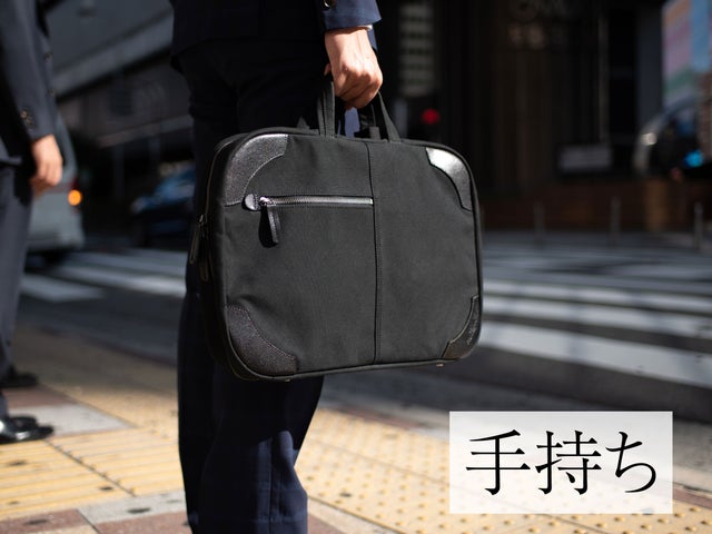 ビジネスバッグの斜め掛けの魅力は斬新さだけではありません。これにより、瞬時に前抱えへの持ち替えが可能に。