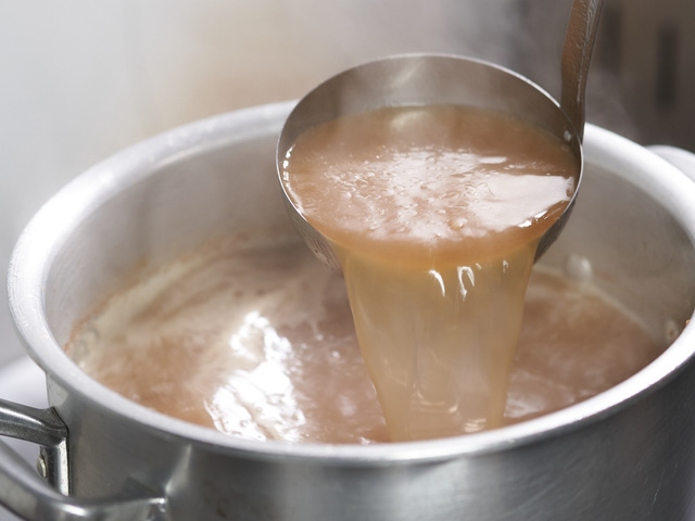 地元、長崎県産の豚骨を2日間じっくり煮込んで作ったベースのスープを、醤油等で仕上げた自慢のオリジナル自家製もつ鍋スープ
