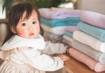 生地の特徴はなんといっても肌ざわり。一般的なタオル生地よりも細い糸で織られた、とても肌ざわりがよいタオル生地です。ホテルにあるような重厚感があるタオルではなく、ホワホワっとした軽さと柔らかさが特徴的で、肌への負担が少なく、生まれたての赤ちゃんから使える優しいタオルです。また、吸水性や速乾性にも優れています。