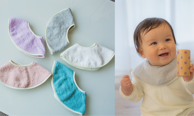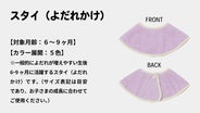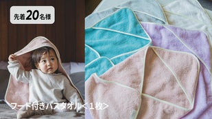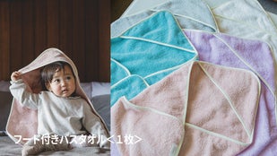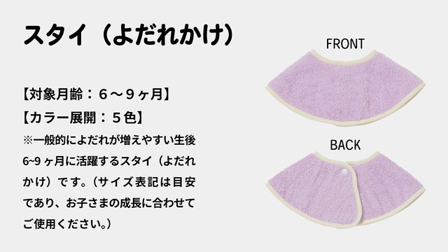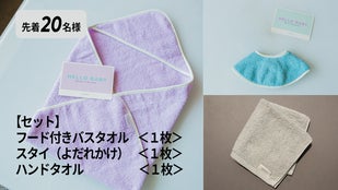 商品は「フード付きバスタオル」と「スタイ(よだれかけ)」の2種類です。