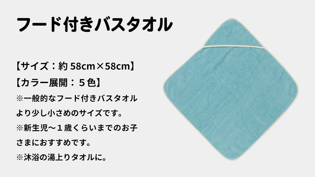 「フード付きバスタオル」は、新生児からの沐浴の湯上りタオルとして便利なアイテムです。出産準備や出産祝いなどにもおすすめです。