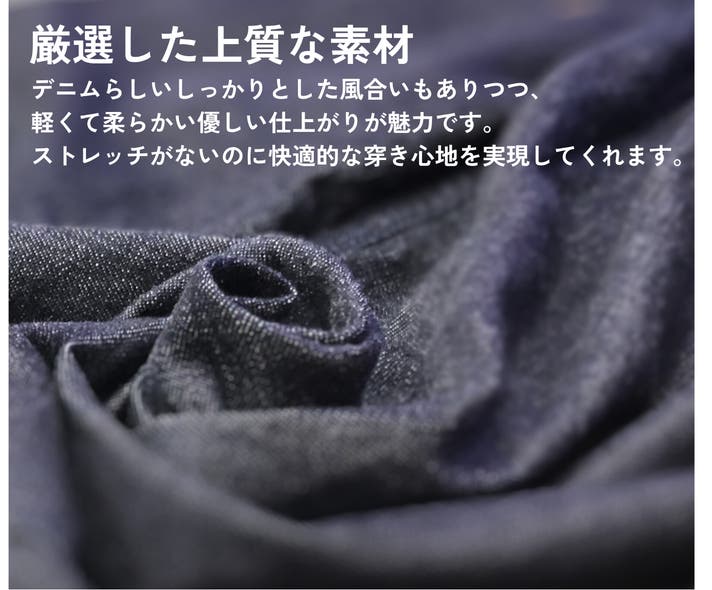 しっかりとした力強い生地ながらも、国産デニムならではの柔らかく肌に馴染む質感がはき心地の良さを生み出しています。