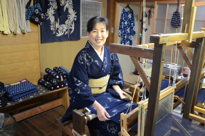作州絣は、太めの木綿糸を使用して織り上げられた素朴な織物で、丈夫なことから庶民の生地として広まりました。一度歴史が途絶えますが、作州絣保存会会長をされている日名川さんが復活させました。2012年に作州絣保存会を立ち上げ、作州絣織り人育成をはじめ、先代から受け継いだものを、次の世代へと繋いでいく・伝達・普及活動などを行っています。