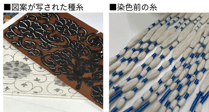 織りあげたときに絵柄がキレイに出るよう点ほどの小さな箇所も丁寧に丁寧に染め分け、織りあげる際にも絵柄がずれないよう一本一本丁寧に織り上げていく。