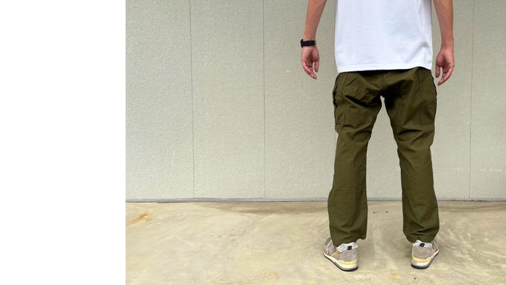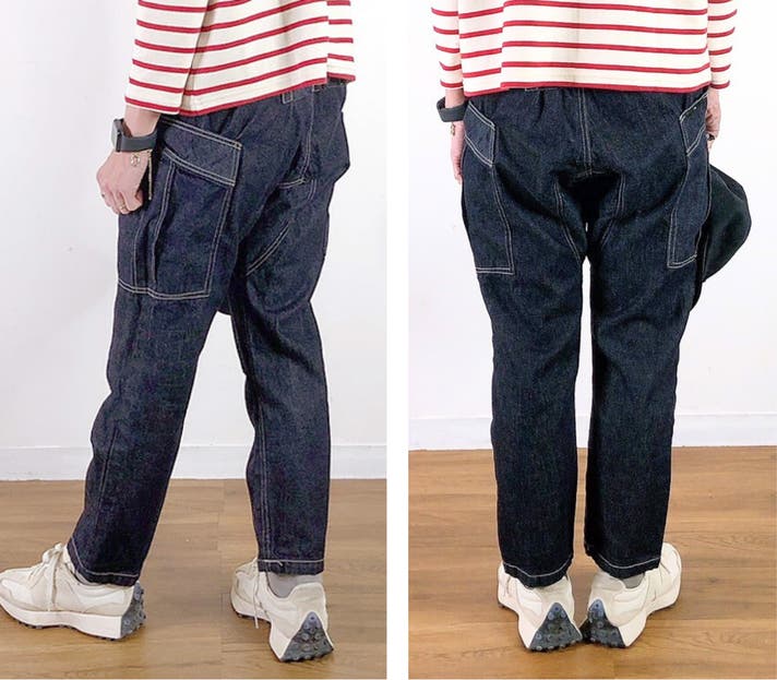 ベイカーパンツは後ろがシンプルになりがちですが、バックシンチに視線が自然に集まるように設計。