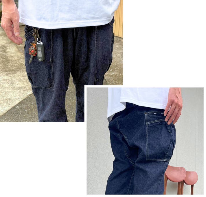 井原産の10オンスデニムならではの、しっかりとした生地感で耐久性の高さと柔らかさを兼ね備えているのも特徴。