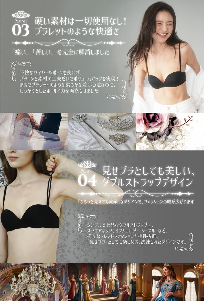 今まで「胸が小さいから」と恥ずかしかったファッションも、このブラを使うようになってから、胸元がきれいに見えて、華やかな場でも堂々と立てるように。パーティードレスやデコルテが見えるファッションでも自信を持って着られるようになりました!