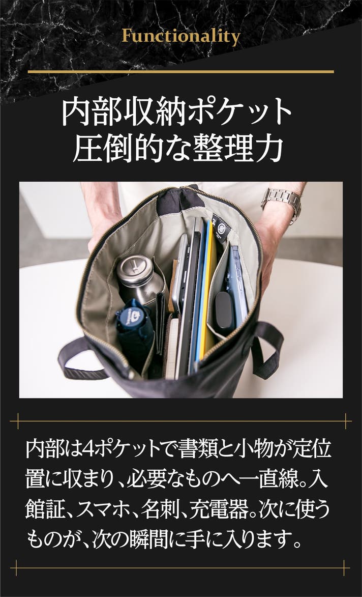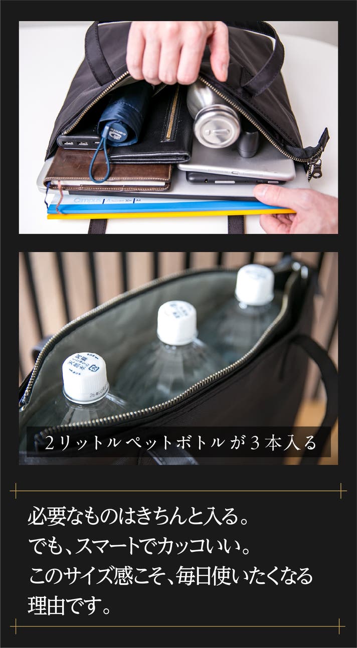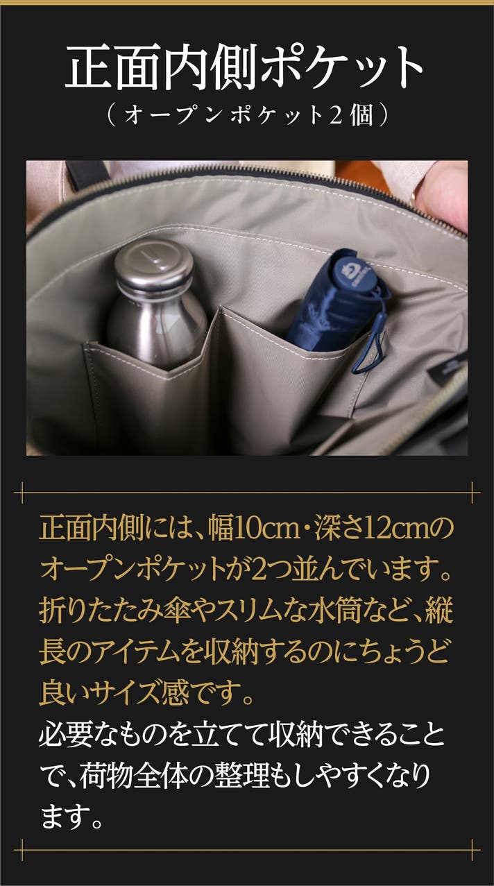 - 合計5ポケットで迷子ゼロ。水筒・傘は縦収納、名刺や小物は定位置。出し入れが速く毎朝仕事が進む!