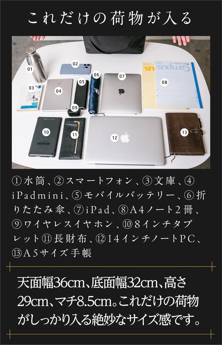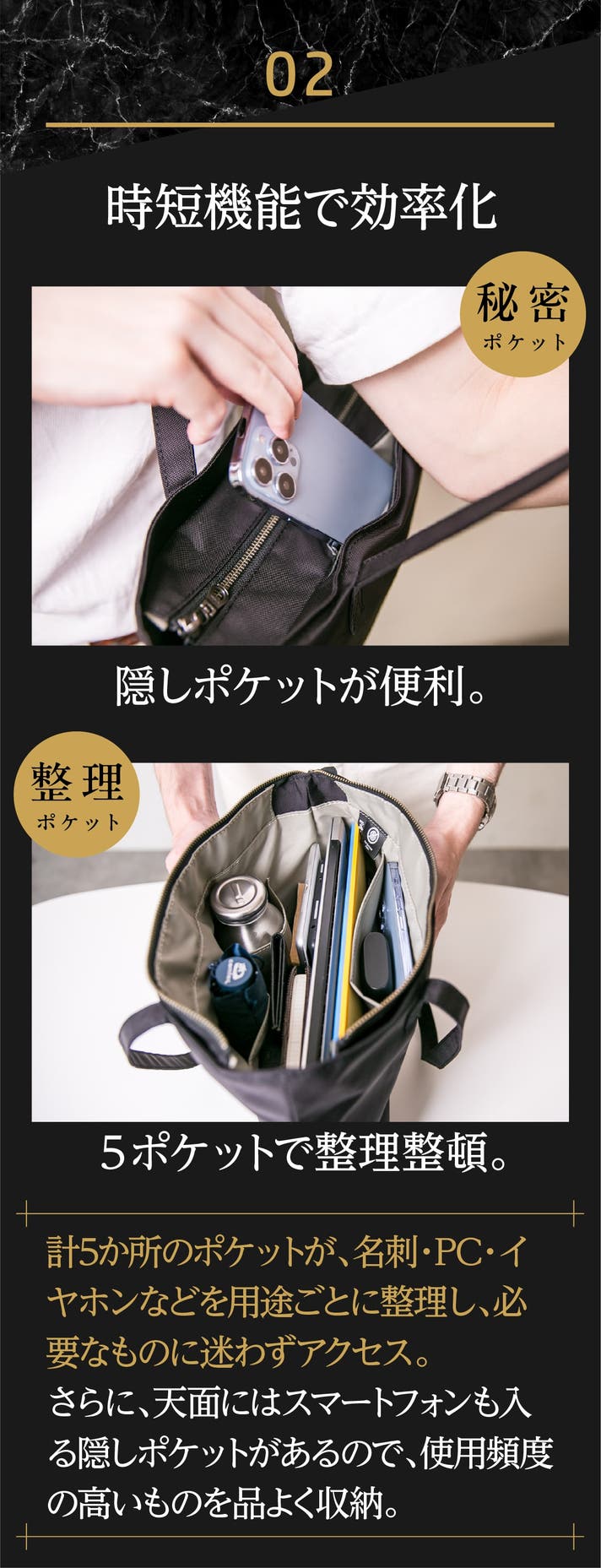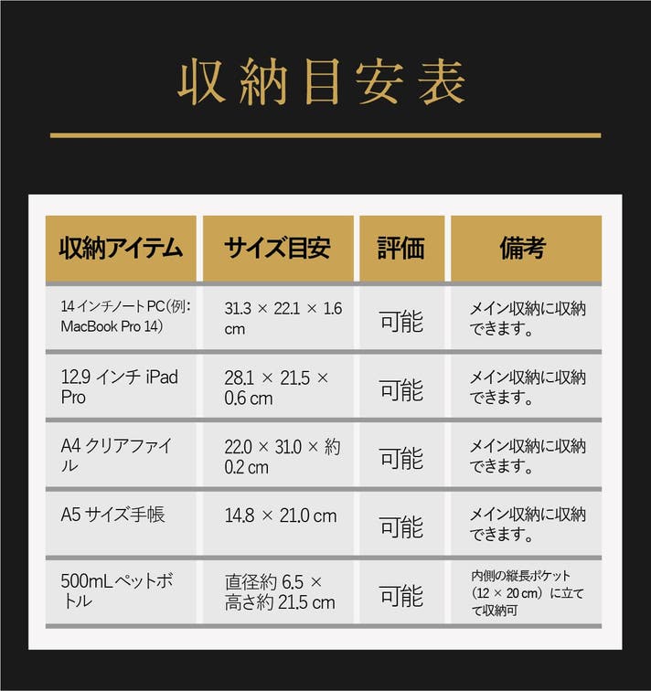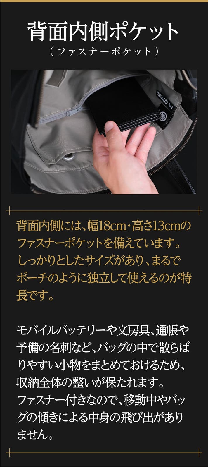 - 合計5ポケットで迷子ゼロ。水筒・傘は縦収納、名刺や小物は定位置。出し入れが速く毎朝仕事が進む!
