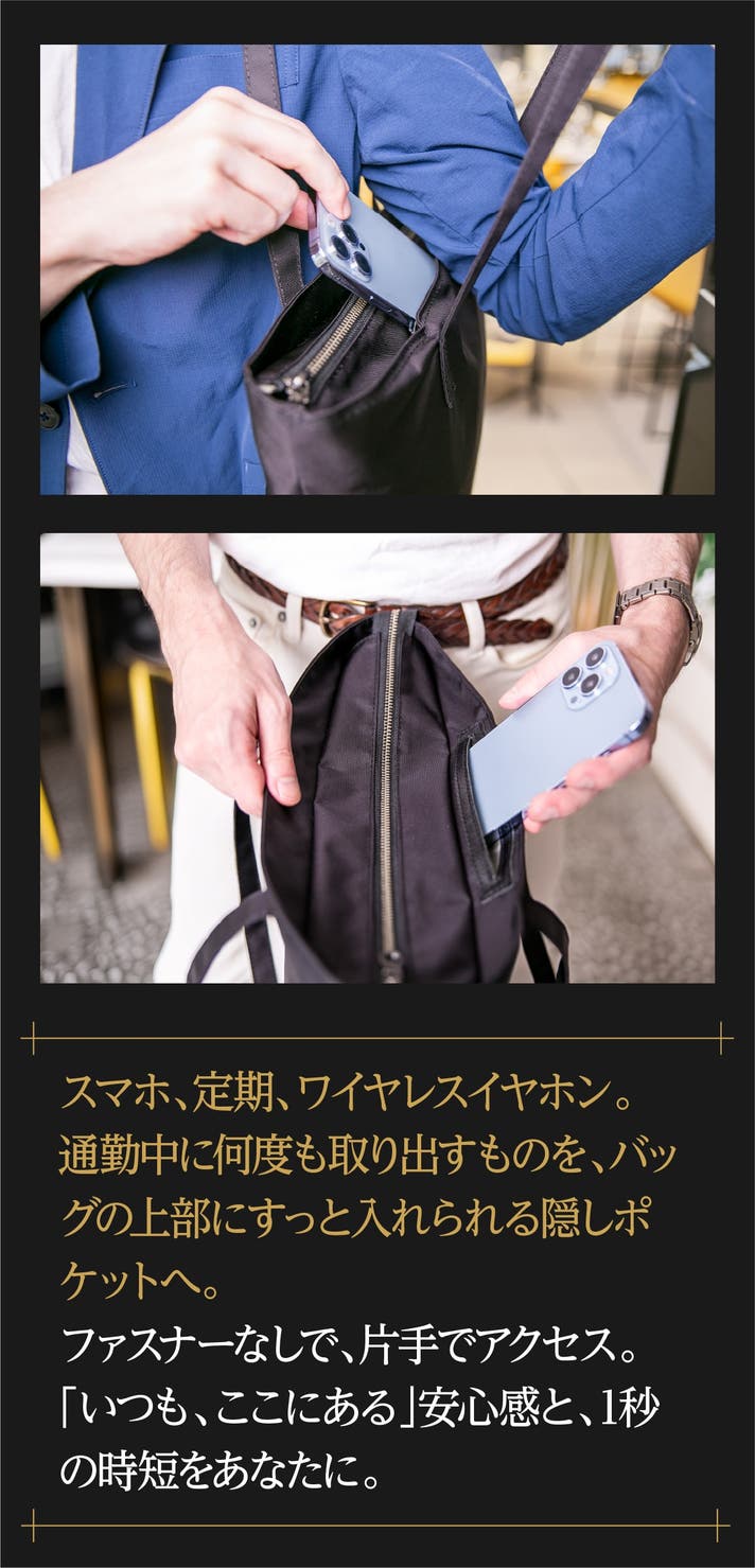 - 隠しポケットで改札爆速!中身を見せず安心、スマホや財布、会計もスムーズ。片手でOKだから楽々!
