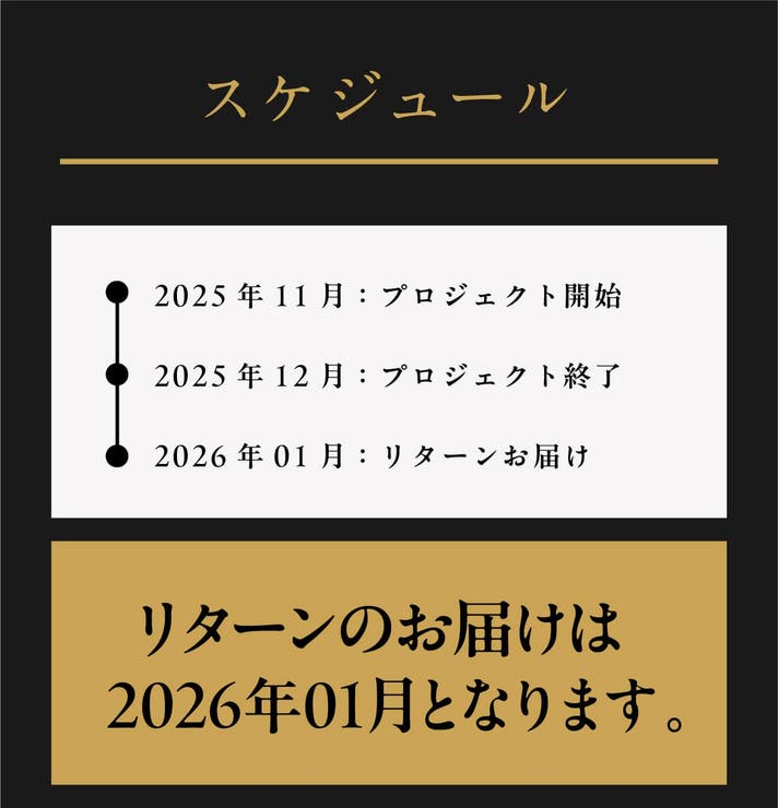 このプロジェクトはAll in型です。目標金額の達成に関わらず、プロジェクト終了日の2025年12月30日までに支払いを完了した時点で購入が成立します。