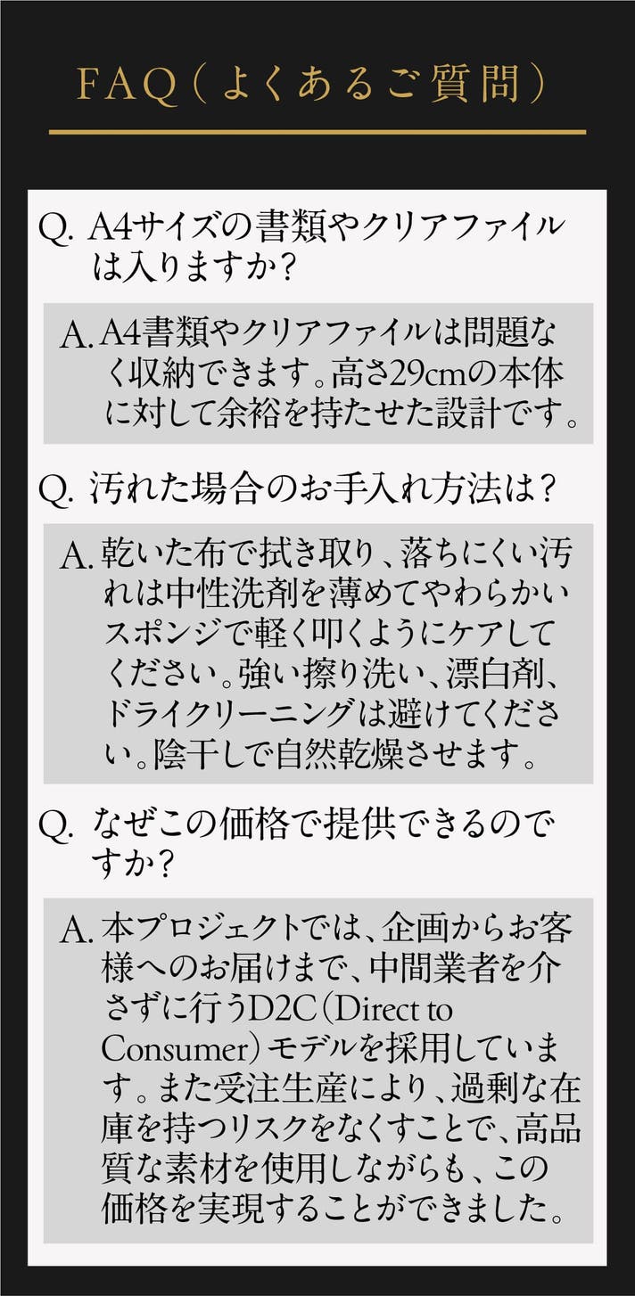 ※製造及び品質向上のため、予告なしに製品仕様及びデザインを変更する場合がございます。 ※天然の牛革を使用しております。小さい色むら、バラ傷がある場合があります。革の個性としてご理解ください。 ※モニター環境により、実際の商品の色合いは多少異なって見える場合があります。 ※ご注文状況、使用原料の供給状況、製造工程上の都合等により、出荷時期が遅れる場合がございます。 ※本文中に記載させていただいたスケジュールは、あくまでプロジェクト公開時点の予定です。プロジェクトの性質上、配送遅延のおそれがございます。原則として、配送遅延に伴うキャンセルはできませんが、リターン配送予定月から3ヶ月を超えた場合には、希望者に限りキャンセルにて対応させていただきます。