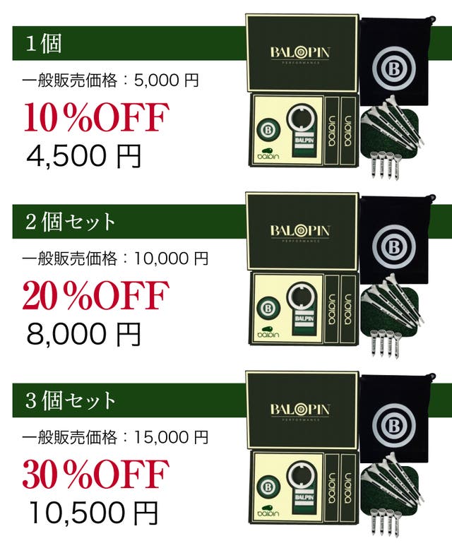 BALOPINはデザイン特許出願が完了しており、おしゃれでありながらも機能性抜群のティーです。従来のティーはショットを打つと衝撃で飛んでしまい紛失することがあります。また、ティーの色と芝の色や光の加減でティーが見えにくくなってしまい、結果飛距離が出にくい、という原因にもなります。BALOPINは芝に対して垂直平行にしっかり刺さるので打った時の衝撃で抜けにくく、また安定した飛距離を出すことが可能です。従来のティーでは満足できなかった方にもご満足いただけると思います。