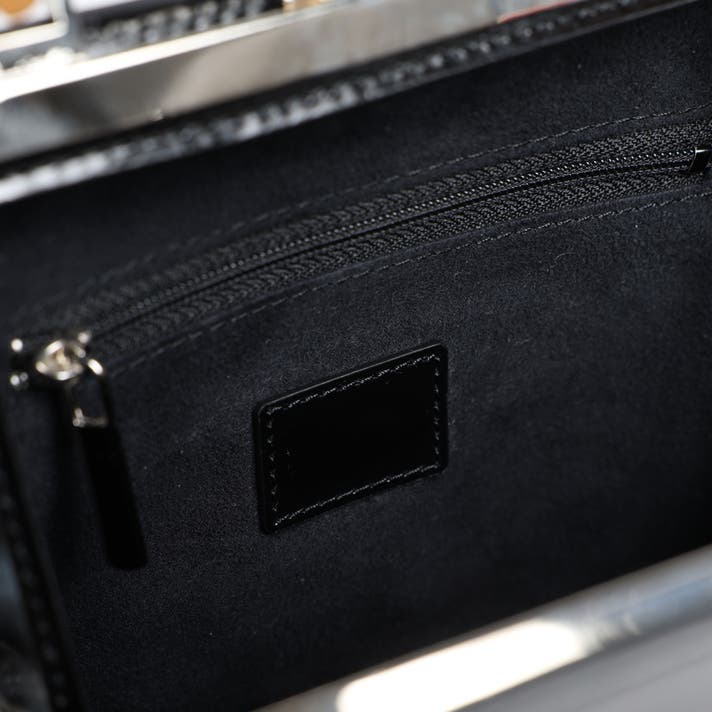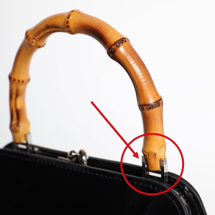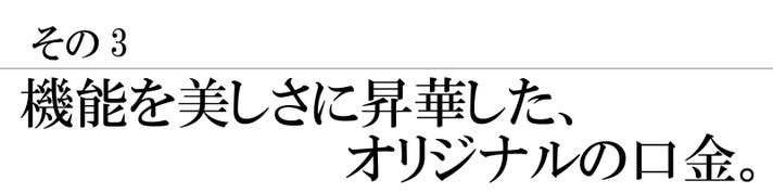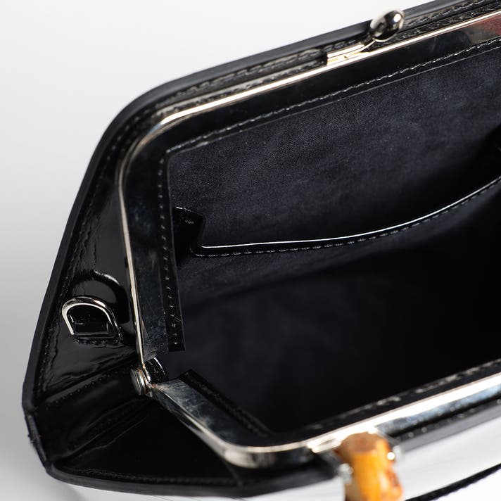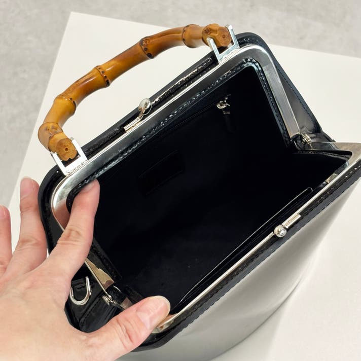 クラシックながらモダンな印象を与える“がま口”には、バンブーハンドルの取り付けを可能にする特別仕様の溶接を施し、四角カンを取り付けたオリジナル仕様を採用 。