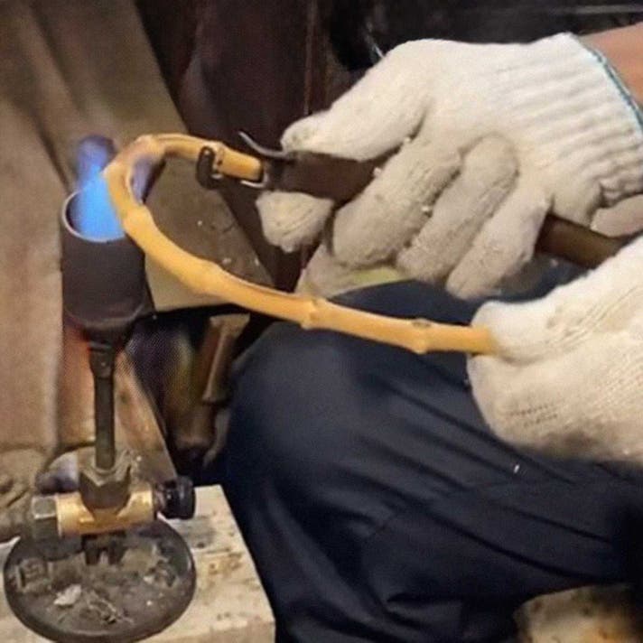 熱いバーナーの火で竹を熱しながら、道具を使い手作業でゆっくりと丸く曲げていく、この途方もない手間と時間をかけることで、しなやかで手に馴染む、美しい曲線が生まれるのです。