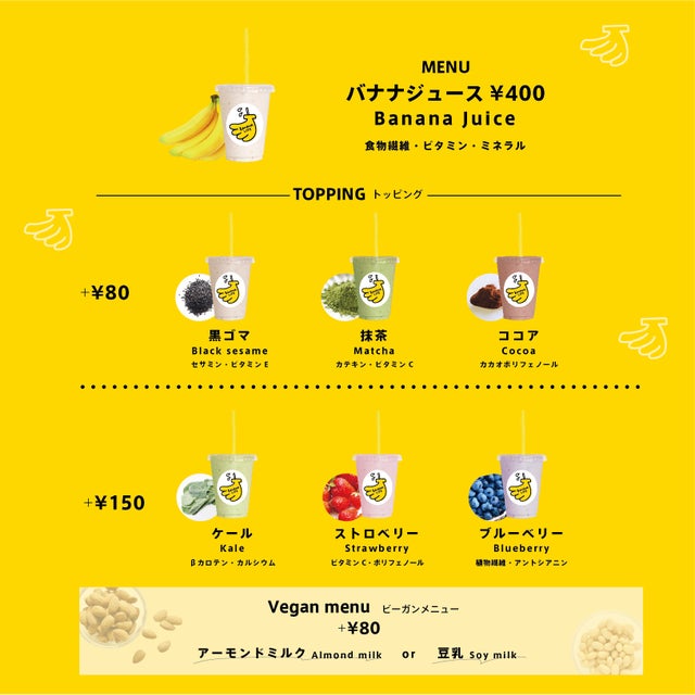 ※通常400円(税込)のバナナジュース(プレーン、トッピング込み、ミルクを豆乳、アーモンドミルクへ変更可)を1ヶ月間お好きなだけお楽しみいただけます。