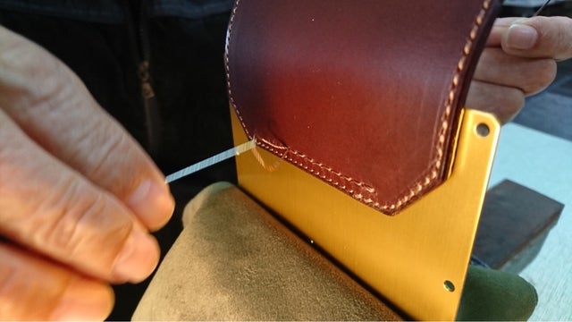 それを今度は革職人にバトンタッチし、アルミと革の異材質を一縫い一縫い手作業で縫っていきます。