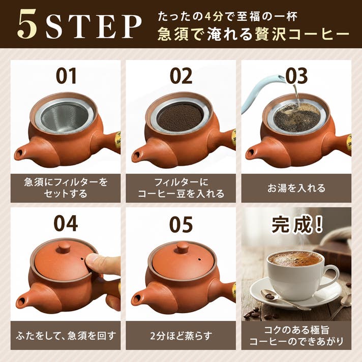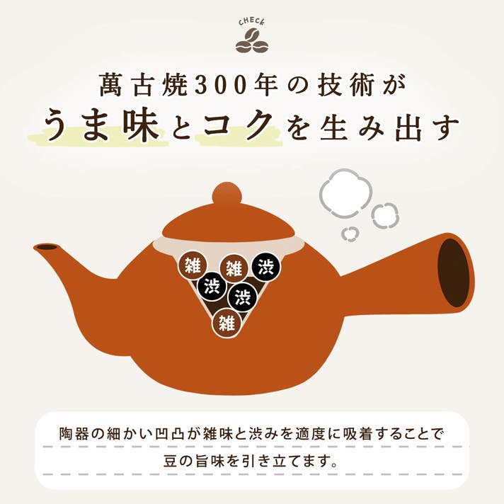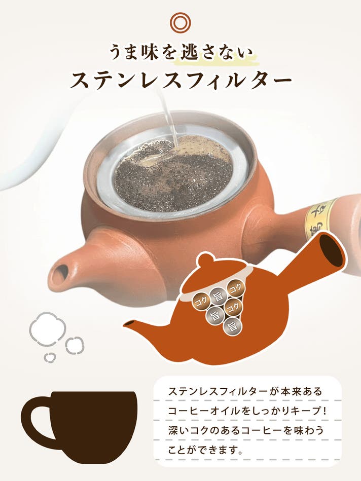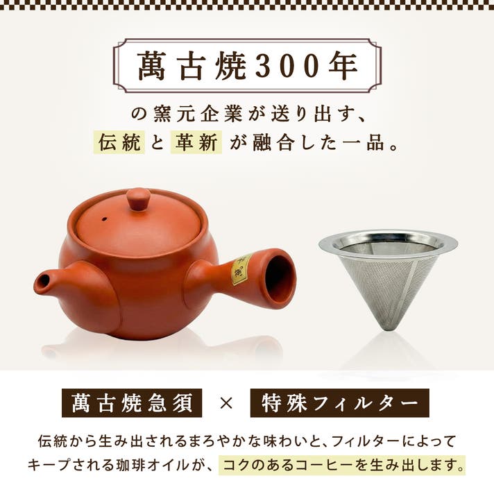 日本には、長い年月をかけて受け継がれてきた優れたものづくりの知恵があります。300年の歴史を持つ萬古焼と、現代のコーヒー文化を掛け合わせることで、誰でも簡単に、雑味のない奥行きある味わいを引き出せる形にたどり着きました。