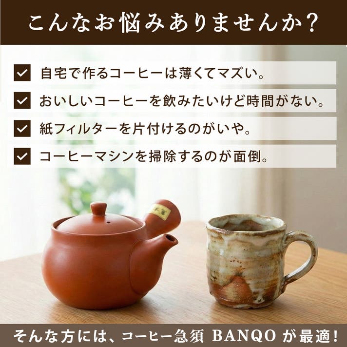 「忙しい日々を送っているビジネスマンの方に、おいしいコーヒーを飲んでくつろいでほしい。」、そんな思いから今回の商品【コーヒー急須 BANQO】を開発しました。