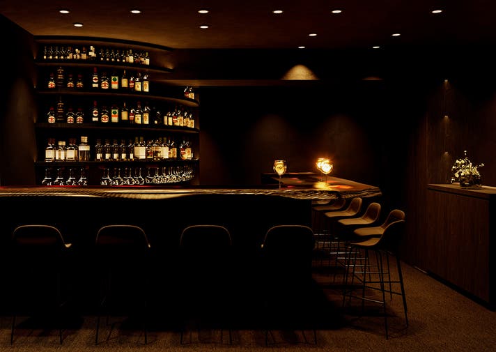 カウンター席は最大10席までご用意。隣席との距離感に配慮し、プライベートゾーンを保ちながらドリンクを楽しめるレイアウトに調整。さらに、お酒のボトルがどの席からも視界に入るよう、湾曲型のボトルラックを構えました。明るさを抑えた照明とシンプルな空間設計によって、皆様の上質な”旅”をお約束します。