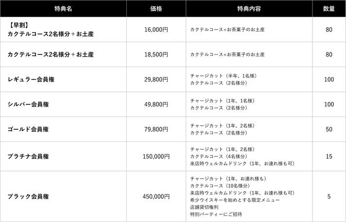 サポーター様へのリターンとして、ここでしか堪能できない豪華ペアリングカクテルコースや、その他豪華特典が獲得できる会員権をご用意。