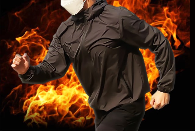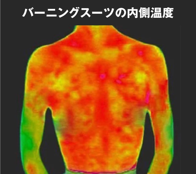 バーニングスーツに使っている素材には内側にシルバーのコーティングをしています。これによって体の熱がこもり、短時間で多くの熱を出し、沢山の汗をかきます。