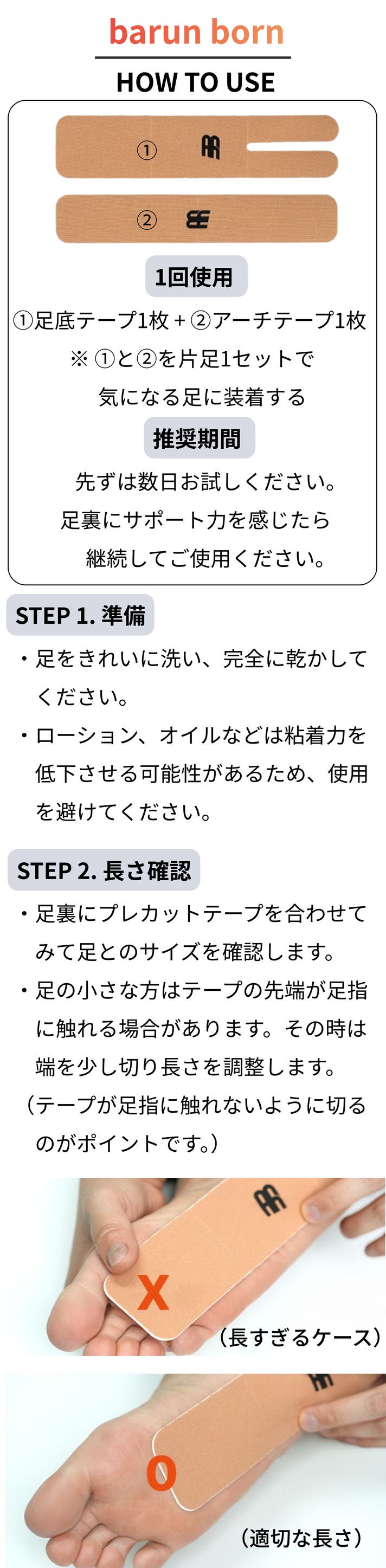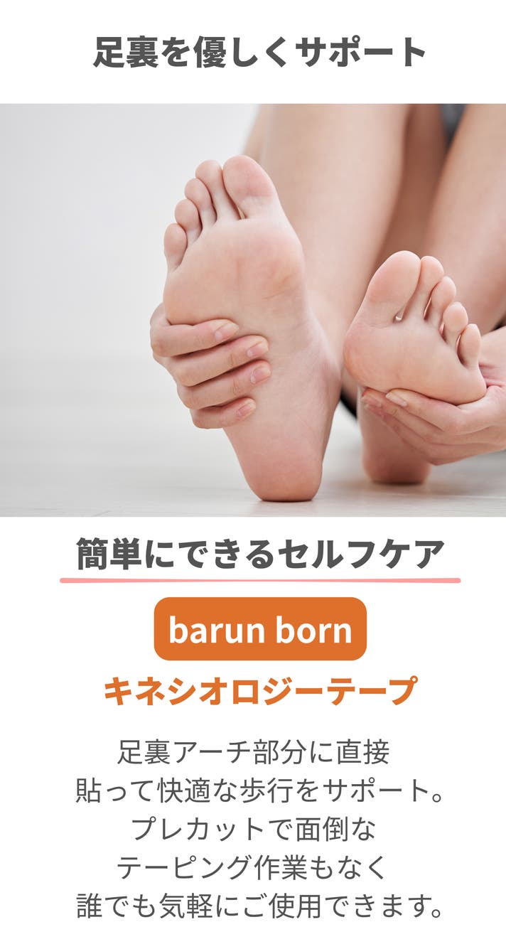 barun bornは、我々の様々なアイデアを詰め込み製作した足裏サポートテーピングです。販売する以上、購入者様に気軽にいつも使用して頂き長く愛される製品を目指しています。