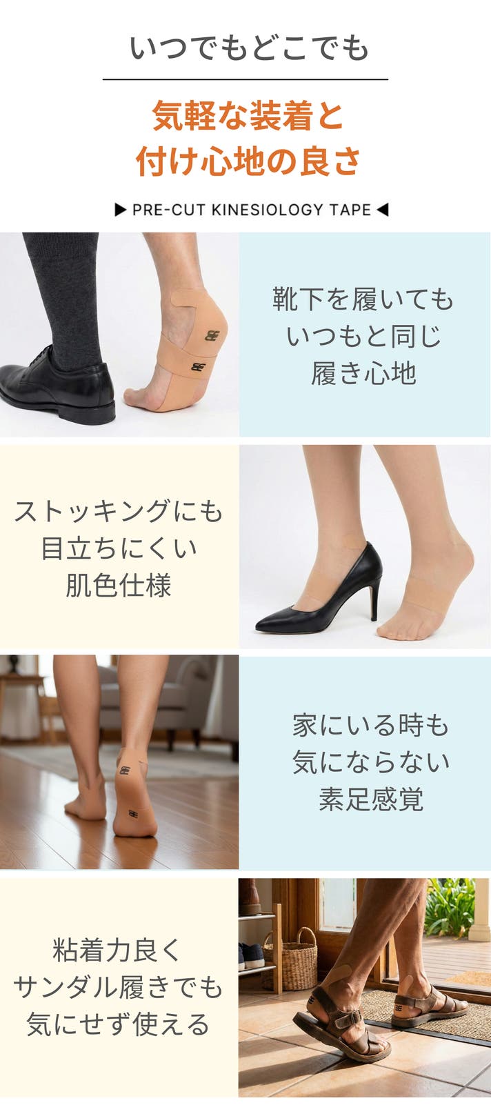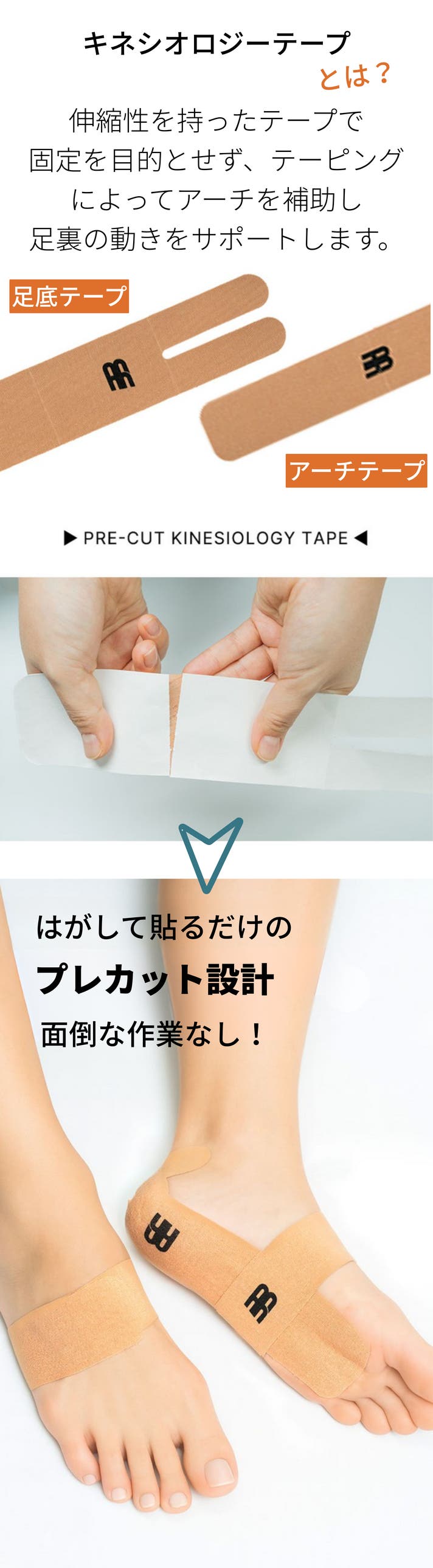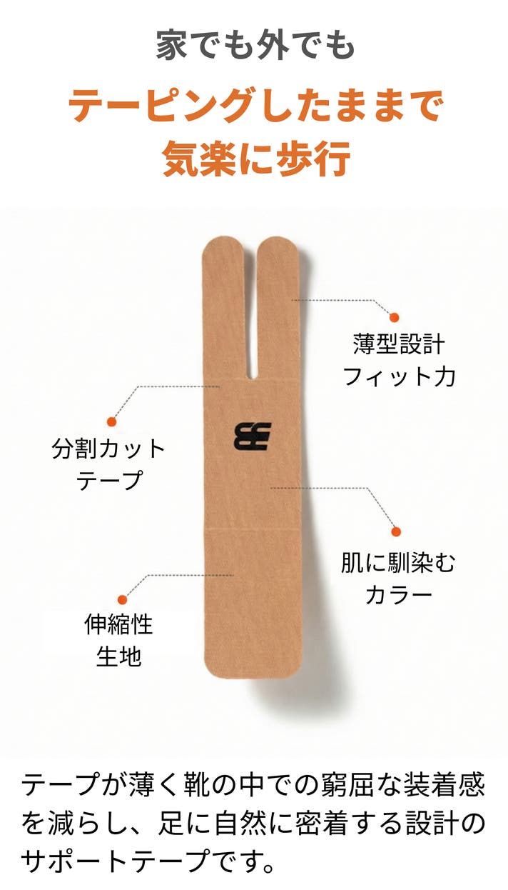 足元を快適に毎日を過ごすためには?毎日そんなことを悩み続けこの製品は研究・開発され誕生しました。生活の中で重労働を強いられる足裏はいつも悩みをたくさん抱えています。テーピングは数多く世の中に存在しますが使い易く使い続けられる製品は多くないと思います。我々の使命は気軽に長く使える良質なフットアイテムです。
