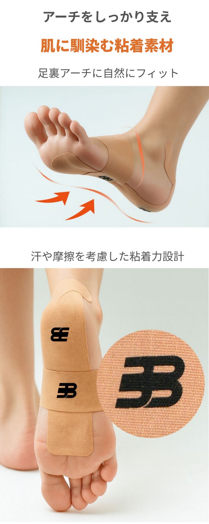 足裏のサポート: 足裏アーチに沿ってテープを貼ることで足裏の働きを補助。