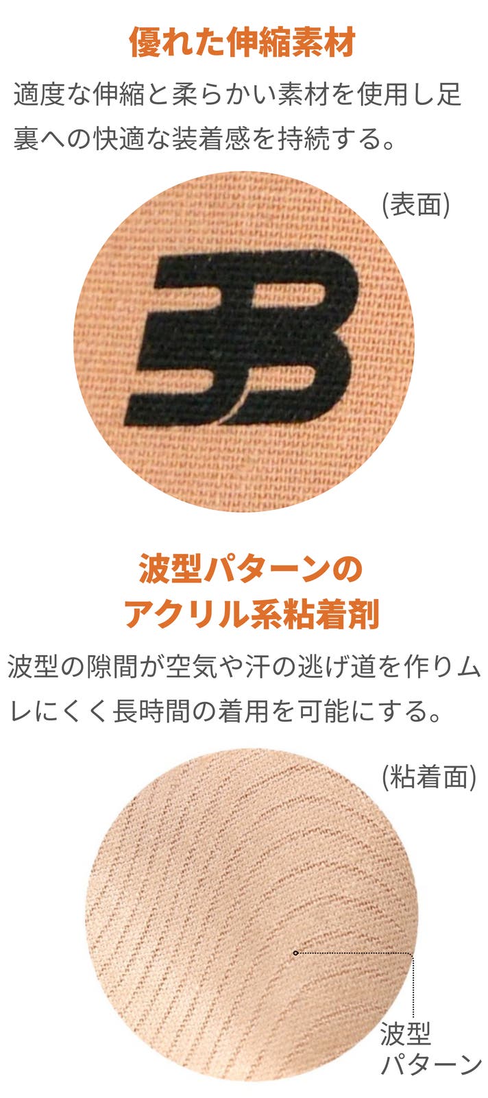 通気性と耐久性: 粘着剤の波型塗工で通気性を確保し長時間の装着が可能。