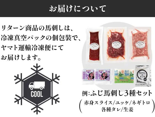 ■馬は生き物ですので、思ったとおりに行かないことがあります。 屠畜した後に病気が発覚し、1頭分の肉がすべて廃棄になる可能性も0ではありません。 そのような事態が発生した場合は、リターン品の発送に遅れが生じる可能性があります。 予めご了承下さい。 ■原則として、発送遅延に伴う応援購入のキャンセルはできませんが、リターン配送予定月から3ヵ月を超えた場合は、希望者に限りキャンセルにて対応させていただきます。 ※お届け先の住所の修正は速やかにお願いいたします。 ※商品到着後は速やかに冷凍庫で保管して下さい。 ※馬刺しは解凍後、再冷凍できません。 ※馬刺しは解凍後、当日中にお召し上がり下さい。 ※お客様都合による返品は出来ません。予めご了承下さい。