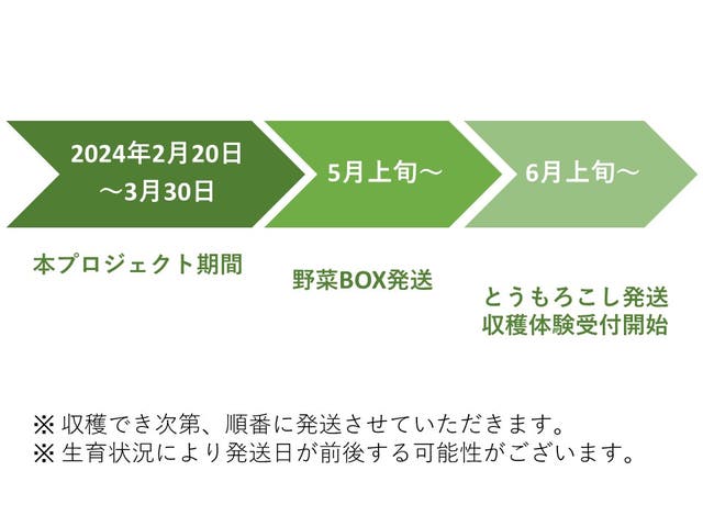 ※天候不順等の理由からリターンの発送時期が前後する可能性がございます。また農作物の成長状況を見極めながら収穫をするため、到着日は指定できかねます。 ※農作物である為、天候不良などにより品質が左右する場合がございます。 ※本文中に記載させていただいたスケジュールは、あくまでプロジェクト公開時点の予定です。応援購入の性質上、配送遅延のおそれがございます。 ※原則として、配送遅延に伴う応援購入のキャンセルはできませんが、 リターン配送予定月から 4ヶ月 を超えた場合には、希望者に限りキャンセルにて対応させていただきます。 まだまだ小さな農園ですが、一日でも早くみなさまにお届けできるように努めてまいります。 どうぞ暖かい応援をよろしくお願いいたします。