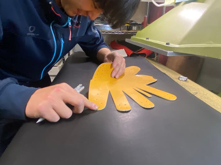 ▲傷がない面を探してグローブの型をあて、機械でプレスしてくり抜きます。
