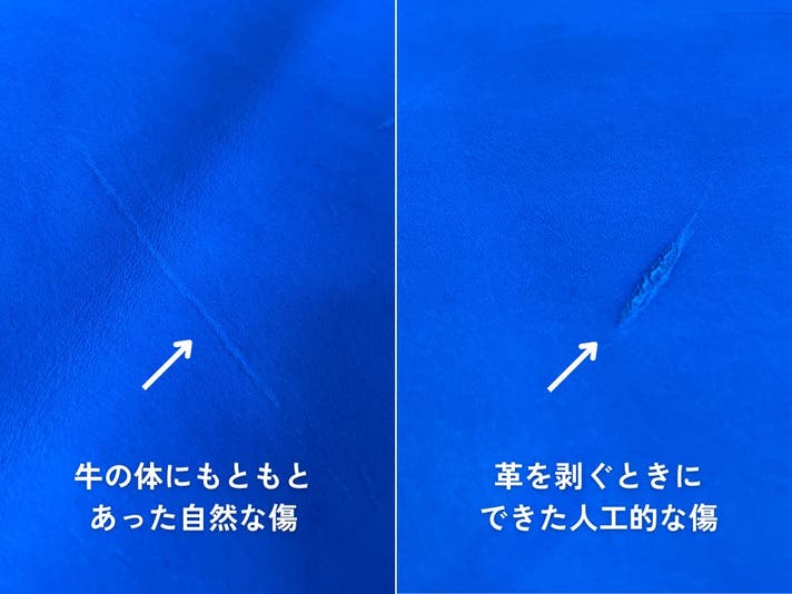 しかし、どんなに品質のいい革でも、もともと牛の体にあった傷や、革を剥ぐときについた刃物傷が残ってしまいます。